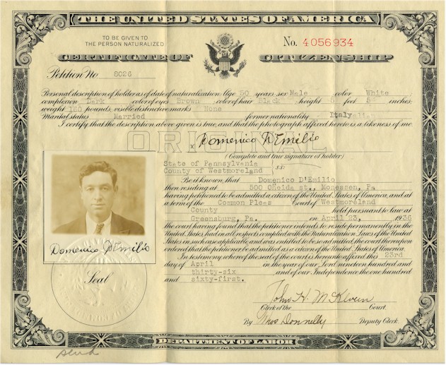 Dominic became naturalized at age 50, on April 23, 1936. He lists his home address at 500 Oneida, although other documents say 200.