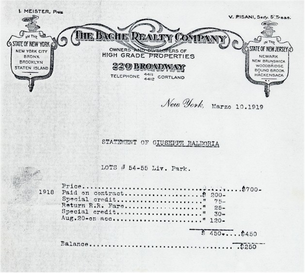 This receipt documents a $200 down payment for lots 54-55, some special credits and reimbursement for "R.R. Fare" plus a $120 payment, leaving a balance due of $250 in 1919.